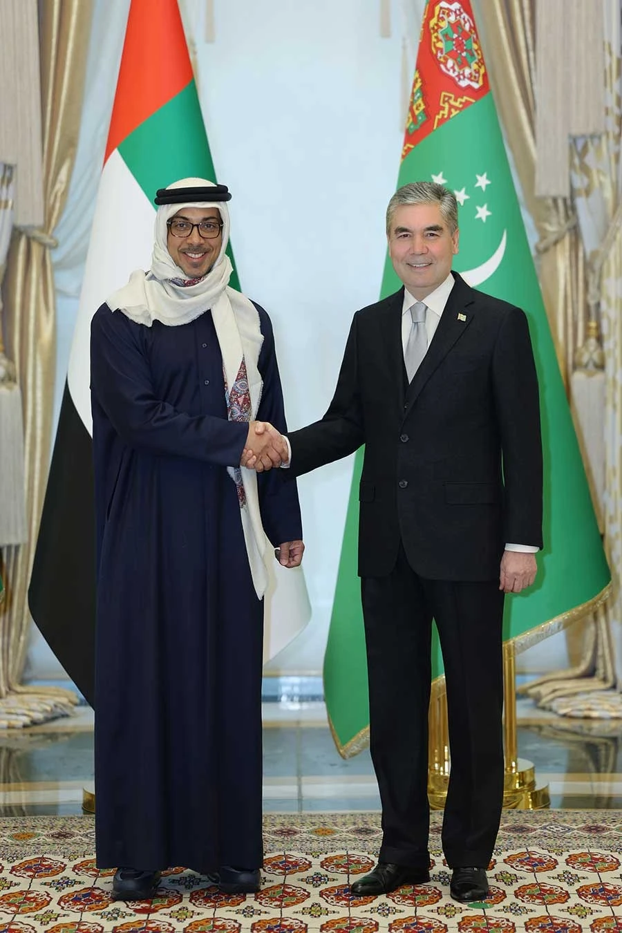 Gahryman Arkadagymyz we BAE-niň wise-prezidenti, Premýer-ministriniň orunbasary, Prezidentiň iş dolandyryş ministri Şeýh Mansur bin Zaýed Al Nahaýýan mähirli salamlaşyp, iki ýurduň Döwlet baýdaklarynyň öňünde surata düşdüler. Görkezilen myhmansöýerlik üçin hoşallyk bildirip, belent mertebeli myhman türkmen topragynda ýene-de saparda bolýandygyna örän şatdygyny belledi.